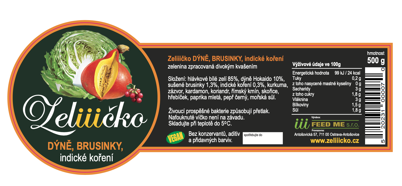 Složení: Bílé hlávkové zelí, dýně hokaido (Farma Mrtináskovi Pustějov) brusinky, kurkuma, zázvor, kardamom, koriandr, římský kmín, hřebíček, paprika mletá, skořice, černý pepř, himálajská sůl.