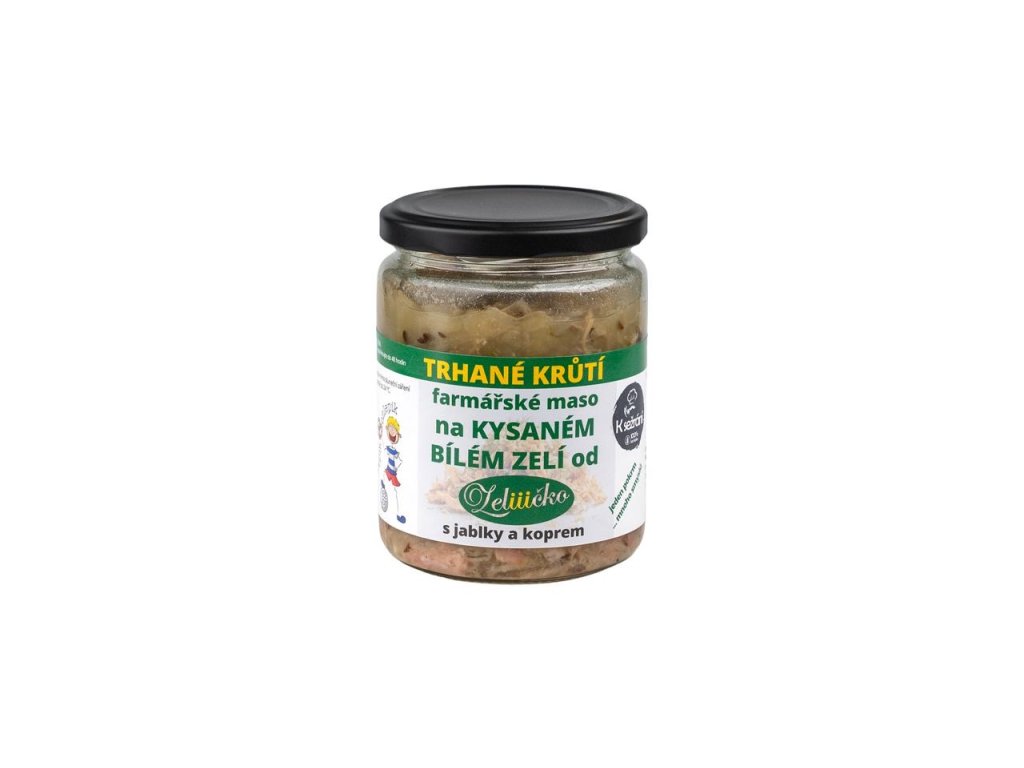 Ve spolupráci s bezlepikem vznikla tato sklenice pro masožravce. Ručně trhané výběrové krůtí maso proložené v Kysaném bílém zelí s jablky a koprem.